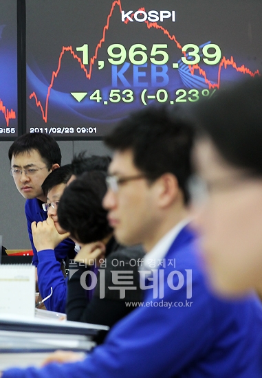 리비아 사태로 급락했던 코스피가 진정된 듯 보합권에서 등락을 반복하고 있다. 23일 오전 서울 중구 을지로2가 외환은행 본점 딜링룸에서 약세로 출발한 코스피 지수가 1960선에서 거래되고 있다.