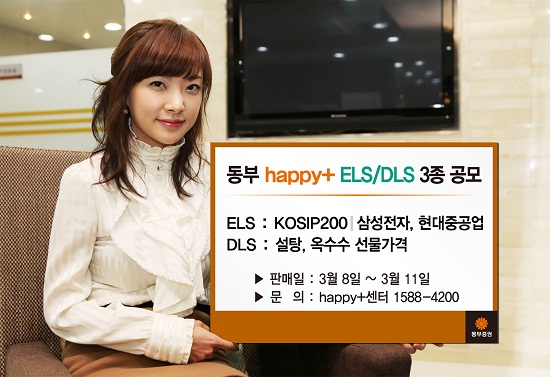 동부증권은 8일부터 오는 10일까지 원금보장형 ‘동부 happy+ 파생결합증권(ELS) 제505회’를, 9일부터 11일까지 스텝다운형 ‘동부 happy+ 파생결합증권(ELS) 제506회’를, 10~11일 양일간은 원금보장형 ‘동부 happy+ 기타파생결합증권(DLS) 제20회’를 판매한다.