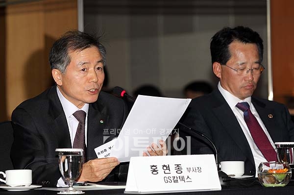 홍현종 GS칼텍스 부사장(왼쪽)이 8일 오후 삼성동 코엑스 인터컨티넨탈호텔에서 열린 환경산업 대·중소기업 동반성장 간담회에서 인사말을 하고 있다.