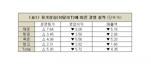 국제유가 상승으로 물류기업들의 운영원가가 늘고, 영업이익은 줄어 경영활동에 직격탄을 맞고 있는 것으로 나타났다.