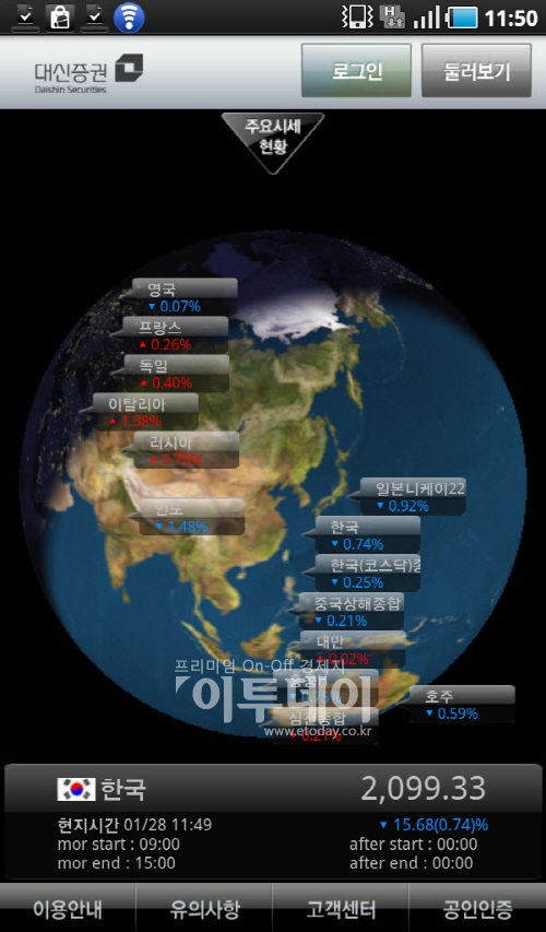 ‘사이보스 터치’는 대신증권 U사이보스 사용자라면 안드로이드 마켓에서 '대신증권'으로 검색해 다운받을 수 있다. 이달 말 까지 거래수수료 무료 행사와 단말 할부금 지원 프로모션이 진행된다.