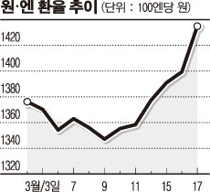 엔화 선물환이 이처럼 급증한 것은 원엔 환율이 1400원대를 돌파했기 때문이다. 17일 원엔 환율은 1434.9원에 마감하며 23개월만에 최고치를 기록했다.