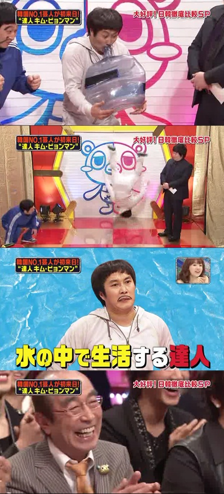더욱이 이날 방송에는 일본 최고의 개그맨도 자리했다. 이 최고의 개그맨은 김병만의 개그가 이어질때마다 깜짝 놀라는 가 하면 박장대소 하는 모습을 보여 김병만을 인정했다.