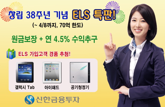 한편 4월29일까지 신한금융투자 ELS에 가입하는 고객은 아이패드, 갤럭시탭 등 경품 추첨 및 공기청정기, 항균이불 등 가입금액에 따른 사은품을 증정하는 ‘2011 봄맞이 페스티벌’ 이벤트에 자동적으로 참여할 수 있다.