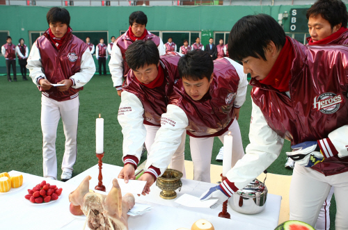 31일 오전 목동구장에서 열린 넥센히어로즈 '2011 필승기원제'에서 선수들이 필승을 기원하고 있다.