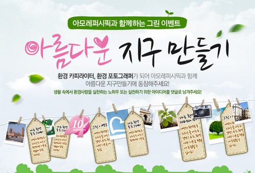 이벤트 참여는 오는 30일까지 생활 속 환경 사랑 실천 노하우 또는 실천하기 위한 아이디어를 댓글로 남기면 된다. 이벤트는 내일부터 아모레퍼시픽 사이트 내 ‘아름다운 지구 만들기’ 페이지(www.amorepacific.com/event/greenearth)를 통해 참여할 수 있으며, 댓글 1개당 100원의 기금이 환경보호 단체인 ‘뿌리와 새싹’에 기부된다. 또한, 우수 환경사랑 아이디어는 향후 실제로 실현을 지원할 예정이다.