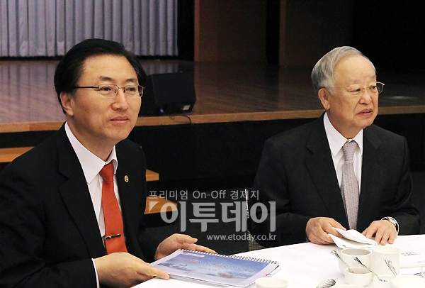 최중경 지식경제부 장관(왼쪽)과 손경식 대한상공회의소 회장이 13일 오전 상공회의소회관 국제회의장에서 ‘산업강국 무역대국으로의 길’을 주제로 CEO 조찬간담회를 하고 있다.