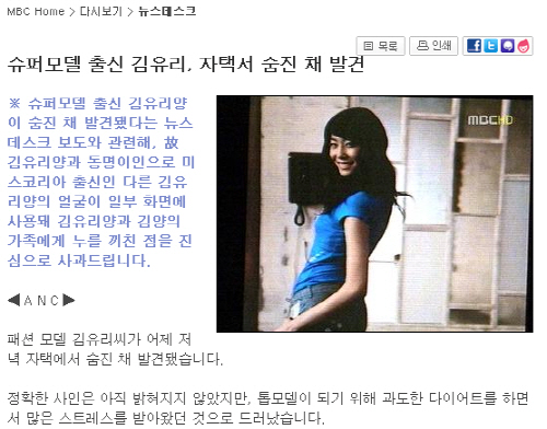 MBC 뉴스데스크가 자살한 모델 김유리의 뉴스를 전하면서 자료사진을 잘못 내보내 논란이 일고 있다.