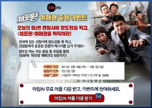 박중훈-이선균의 이색콤비로 연일 화제를 모으고 있는 체포왕의 예매권 증정 이벤트에 참여하고자 하는 네티즌들은 아임IN에 접속한 뒤, 가까운 경찰서에 발도장을 찍고 대한민국 경찰을 위한 응원 메시지를 남기면 된다.