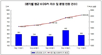 특히 간접투자상품 관련 민원.분쟁은 2008년 4분기에 급증한 이후 10분기 연속 감소세를 지속한 것으로 나타났다. 지난 2008년 4분기에 596건이던 간접투자상품 관련 민원분쟁은 354건(2009.1분기)→266건(2분기)→208건(3분기)→145건(4분기)→135건(2010년1분기)→112건(2분기)→104건(3분기)→63건(4분기)→59건(2011년1분기)으로 줄어들었다.