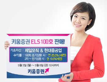 키움증권은 오는 6일까지 최대 연 25%의 수익을 추구하는 주가연계증권(ELS) 100호를 판매한다고 2일 밝혔다.