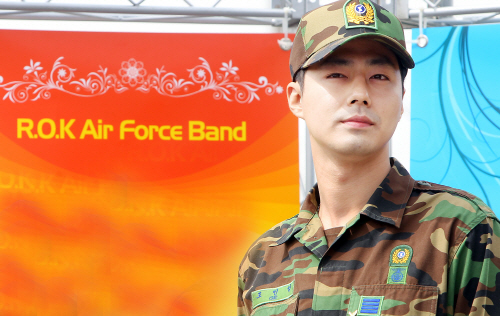 4일 오전 배우 조인성이 경기도 평택시 오산 공군작전사령부에서 공군 군악대 병장으로 군 복무를 마치고 팬들을 향해 거수 경례를 하고 있다.