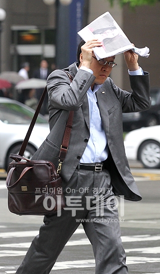 화창한 주말을 뒤로 하고 사흘간 전국에 비 소식이 있는 9일 오전 서울 여의도에 직장인이 신문으로 비를 피하며 출근길을 서두르고 있다.