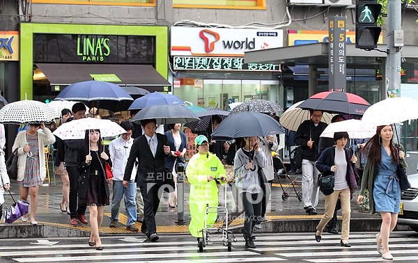 화창한 주말을 뒤로 하고 사흘간 전국에 비 소식이 내린 9일 오전 서울 여의도에 직장인들이 우산으로 비를 피하며 출근길을 서두르고 있다.