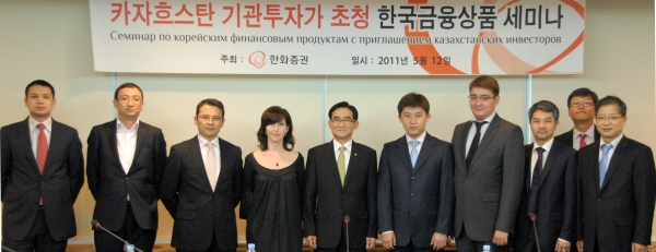 ▲12일 카자흐스탄 기관투자가, 한화증권 임일수 대표이사(왼쪽부터 5번째) 및 임직원이 여의도 한화증권빌딩에서 기관초청 설명회를 갖고 한국금융시장 육성 및 도약을 위한 노력을 다짐했다.