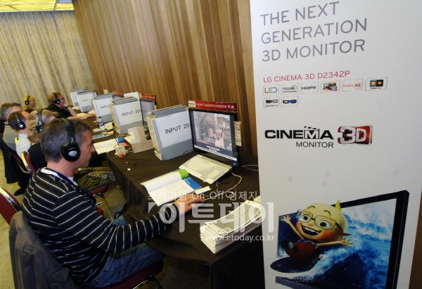 ▲12일 서울 여의도 63빌딩 컨벤션센터에서 열린 '세계 공영TV 서울총회(INPUT 2011)'의 '3D 세션'에서 참석자들이 LG 시네마 3D 모니터를 사용해보고 있다. (LG전자)