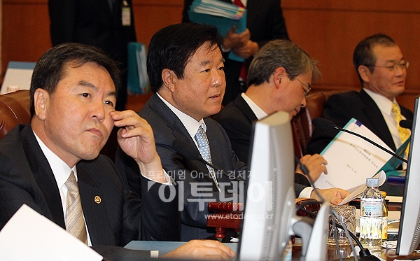 민상기 공적자금관리 위원회 위원장(왼쪽 두번째)이 17일 오후 서울 여의도 금융감독원에서 열린 전체회의에 참석해 고민스러운 표정을 짓고 있다.