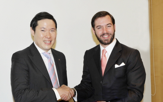 ▲조현상 효성 산업자재PG장과 기욤 룩셈부르크 왕세자가 19일 효성 본사에서 만나 방갑게 악수하고 있다.