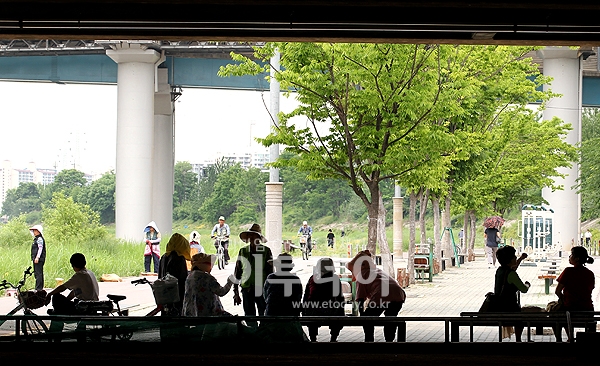 여름 더위가 계속되는 7일 오후 서울시 도봉구 창동교 부근 중랑천에서 나들이 나온 시민들이 그늘에 앉아 쉬고 있다.
