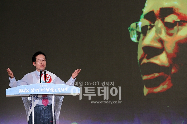 4일 오후 서울 송파구 방이동 올림픽공원 체조경기장에서 열린 한나라당 전당대회에서 당 대표 경선에 나온 홍준표 후보가 정견발표를 하고 있다.