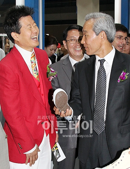 2011 위조상품비교전시회가 열린 6일 오전 서울 강남구 삼성동 코엑스에서 개막식에 참석한 김종훈 외교통상부 통상교섭본부장(오른쪽)과 태진아 관세청 홍보대사가 밝은 표정으로 이야기를 나누고 있다.