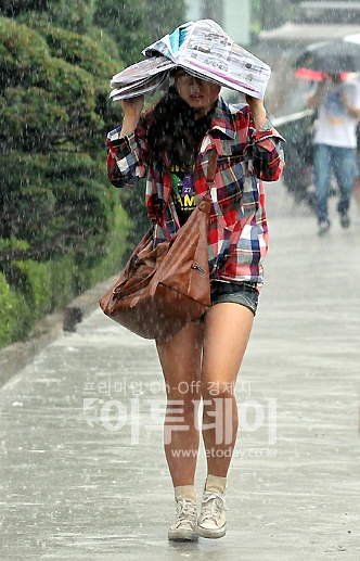 중부지방에 위치한 장마전선의 영향을 받아 곳곳에 비가 쏟아지는 7일 오전 서울 여의도에 한 시민이 신문으로 비를 막으며 발걸음을 서두르고 있다.