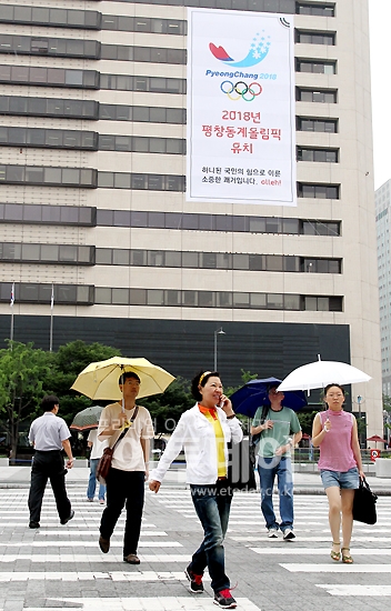 평창 2018 동계올림픽 유치단이 성공의 영예를 안고 귀국하는 8일 서울 종로구 세종로 올레KT광화문지사에 축하 현수막이 걸려있다.