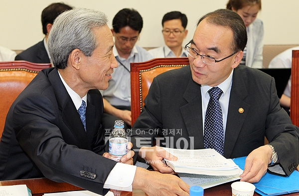 [포토]대화 나누는 박재완 장관과 김종훈 통상교섭본부장