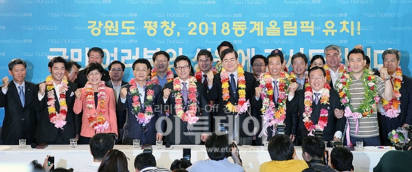 2018년 동계올림픽 개최권을 따낸 평창유치위원회 대표단이 8일 오후 대한항공 전세기편으로 인천공항을 통해 귀국 후 열린 기자회견에서 기념촬영을 하고 있다.