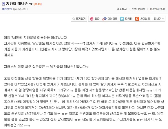 그는 "(지하철 안에서) 제 옆의 할아버지가 두 주먹을 불끈 쥐고 차려자세로 계셨는데 제 옆 엉덩이를 자꾸 툭툭 쳤다"면서 "이는 물론 지하철 운행으로 인한 반동이겠지만, 너무 신경쓰였다"고 썼다. 이어 "진짜 나쁜 의도로 손 위치를 선정하시나 하는 생각도 든다"면서 "저는 늘 기도하는 손(양손을 가운데로 모은 자세)을 한다"면서 "남자들은 기도하는 손이 어렵냐"고 덧붙였다.