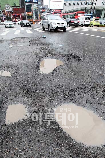 20여일 이상 계속되는 장맛비에 시내 도로 곳곳이 파손되고 물웅덩이가 만들어져 운전자들의 세심한 주의와 관계자들의 신속한 조치가 필요하다. 14일 오후 서울 남대문로 일부 도로가 파손되어 자동차의 타이어가 손상되는 등 안전사고가 우려되고 있다.