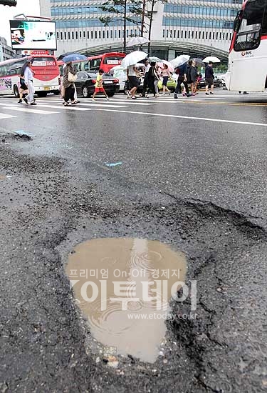 20여일 이상 계속되는 장맛비에 시내 도로 곳곳이 파손되고 물웅덩이가 만들어져 운전자들의 세심한 주의와 관계자들의 신속한 조치가 필요하다. 14일 오후 서울 남대문로 일부 도로가 파손되어 자동차의 타이어가 손상되는 등 안전사고가 우려되고 있다.