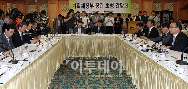 박재완 기획재정부 장관이 15일 오후 서울 강남구 논현동 임피리얼 팰리스 호텔에서 열린 기획재정부장관 초청 건설업계 대표 간담회에 참석해 인사말을 하고 있다.