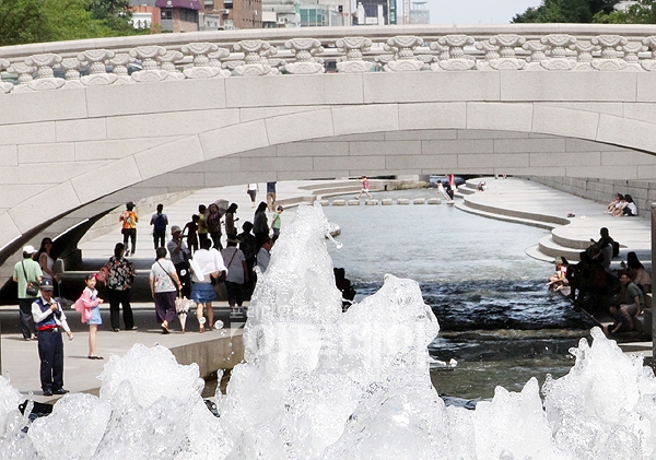장마가 끝나기 무섭게 전국 곳곳에 폭염특보가 내린 18일 오후 서울 청계천에 시민들이 피서를 즐기고 있다.