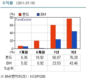 이같은 ‘운용의 묘’는 수익률을 통해 확인할 수 있다. 제로인에 따르면 18일 현재 이 펀드의 1년 수익률은 60.07%로 벤치마크(KOSPI200) 23.53%를 36.54%포인트 상회하고 있다. 6개월 수익률은 19,92%를 기록하며 BM(0.92%)을 21배나 웃돌고 있다.