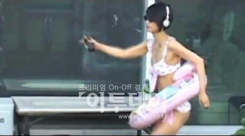 비키니 차림에 선글라스를 쓰고 튜브로 배를 가린채, 음악에 맞춰 춤을 추는 '옥탑방 비키니' 동영상이 화제다.