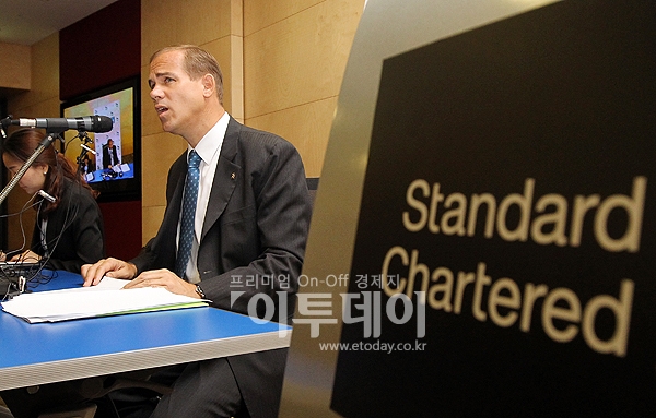 리차드 힐(Richard Hill) SC 제일은행장이 25일 오전 서울 중구 남대문로 제일지점에서 열린 파업사태 관련 기자간담회에 참석해 입장을 밝히고 있다.