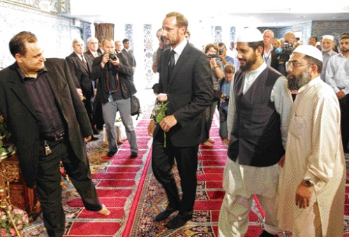 하콘 노르웨이 왕자(가운데)가 26일(현지시간) 오슬로의 이슬람사원을 방문했다. 지난 23일 반이슬람 근본주의자인 안데르스 베링 브레이비크는 폭탄테러와 총격으로 70여명을 살해하면서 유럽 전역에는 다문화주의에 대한 논란이 확산되고 있다. 오슬로/로이터연합뉴스