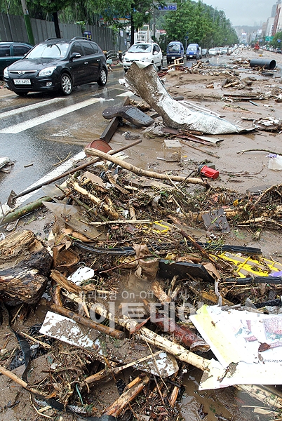 중부지방에 기습폭우가 내리고 있는 27일 오후 서울 서초구 방배동의 한 거리에 폭우와 함께 쓸려 내려온 잔해들이 도로에 쌓여있다.