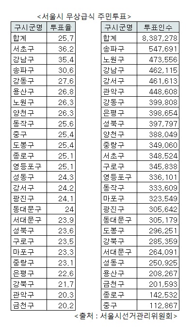 서울시 무상급식 주민투표를 실시한 25개 구 가운데 33.3%를 넘긴 곳은 서초구와 강남구 두 곳 뿐인 것으로 나타났다.