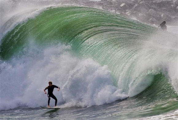 미국 캘리포니아 뉴포트비치에서 1일(현지시간) 한 서퍼가 집채만한 파도를 타고 있다. 이날 뉴포트비치의 파도 높이는 6m에 달했다. 뉴포트비치/AFP연합뉴스