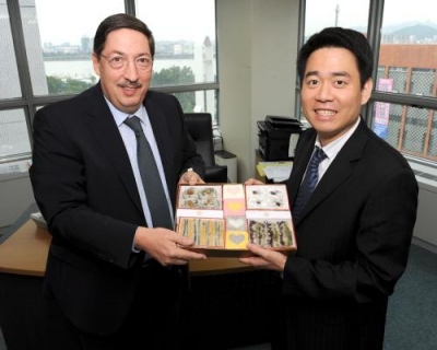 ▲한진해운 한국지점 세일즈 직원이 7일 서울 여의도에 위치한 지오디스 윌슨 코리아를 방문해 마티아스 스텍만사장에게 전통 떡을 선물하고 있다.