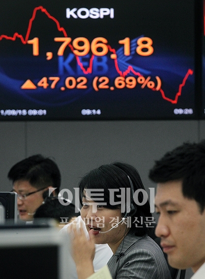 유로존의 그리스 재정 지원 가능성으로 국내 증시가 단숨에 상승하고 있다. 15일 오전 소공동 외환은행 딜링룸에서 코스피 지수가 전날보다 47.02 포인트 상승한 1796.18을 나타내고 있다.