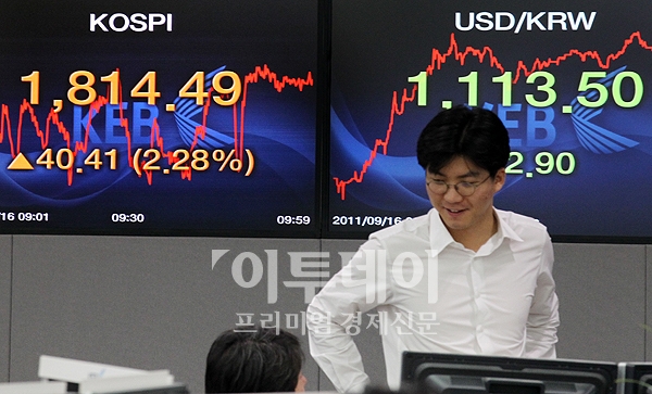 유럽중앙은행(ECB)의 달러화 유동성 공급 발표로 국내 증시가 이틀째 1800선으로 상승했다. 16일 오전 소공동 외환은행 딜링룸에서 코스피 지수가 전날보다 40.41 포인트 상승한 1814.49를 나타내고 있다..