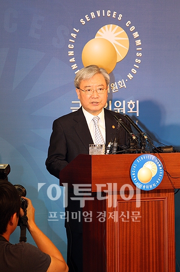 김석동 금융위원장이 18일 오후 여의도 금융위원회 기자실에서 토마토와 제일, 프라임 등 영업정지 대상 저축은행 명단을 발표하고 있다.