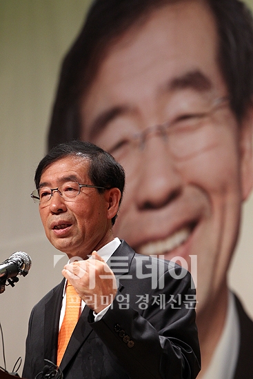 박원순 변호사가 21일 오전 효창동 백범기념관에서 10·26 보궐선거 서울시장 출마를 공식 선언한 가운데 취재진의 질문에 답하고 있다.