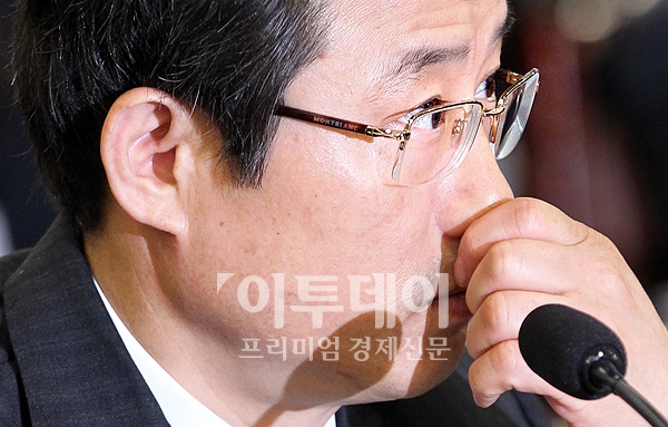 권혁세 금융감독원장이 23일 여의도 금융감독원에서 열린 국회 정무위 국정감사에 참석해 의원들의 질의에 곤란한 표정을 하고 있다.