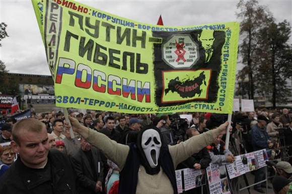 블라디미르 푸틴 러시아 총리의 대통령 선거 출마 소식이 전해진 25일(현지시간) 모스크바 중심가에서 시위대가 ‘푸틴은 러시아의 죽음’이라는 플래카드를 들고 행진하고 있다. 모스크바/AP연합뉴스