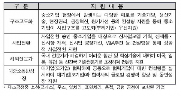 기술분야는 컨설팅대상 및 내용에 따라 △구조고도화 △사업전환 △해외전문가 △대중소동반성컨설팅으로 구분된다.