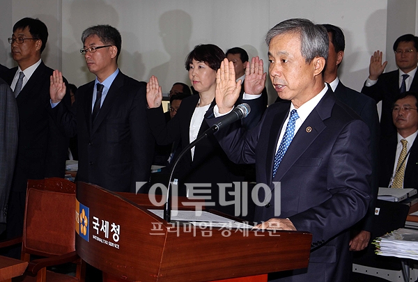 이현동 국세청장이 26일 오전 종로구 수송동 서울지방국세청에서 열린 기획재정위의 국세청 국정감사에 출석해 선서를 하고 있다.